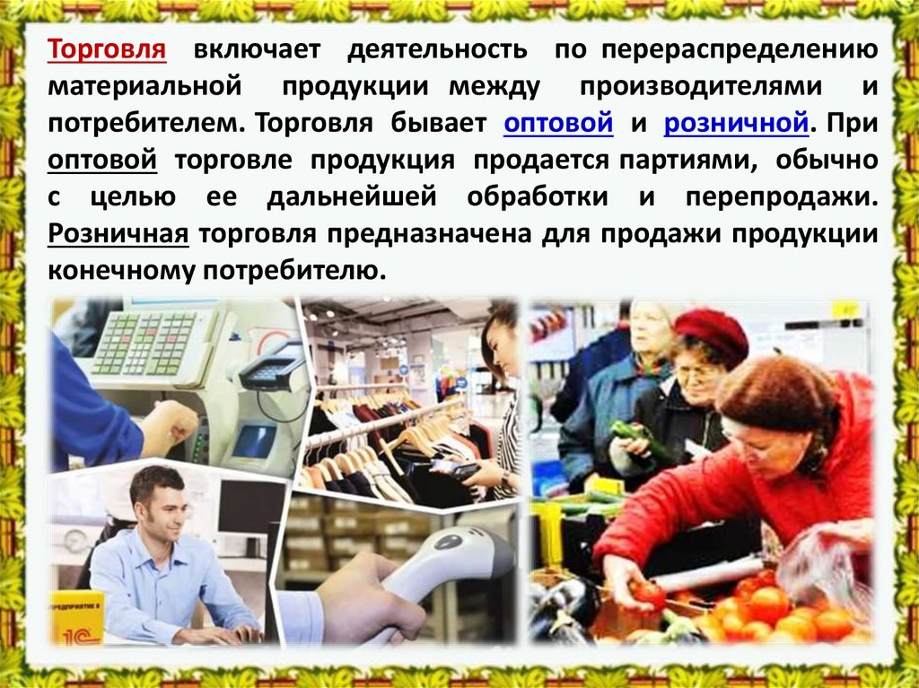 потребителем. Торговля бывает оптовой и розничной. При
