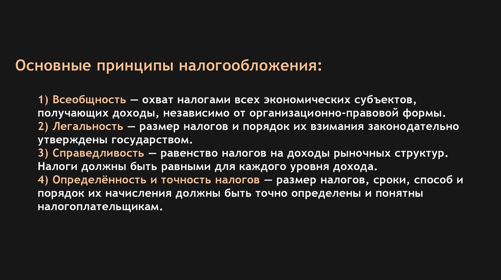 Основные принципы налогообложения:1) Всеобщность — охват налогами всех экономических субъектов,
