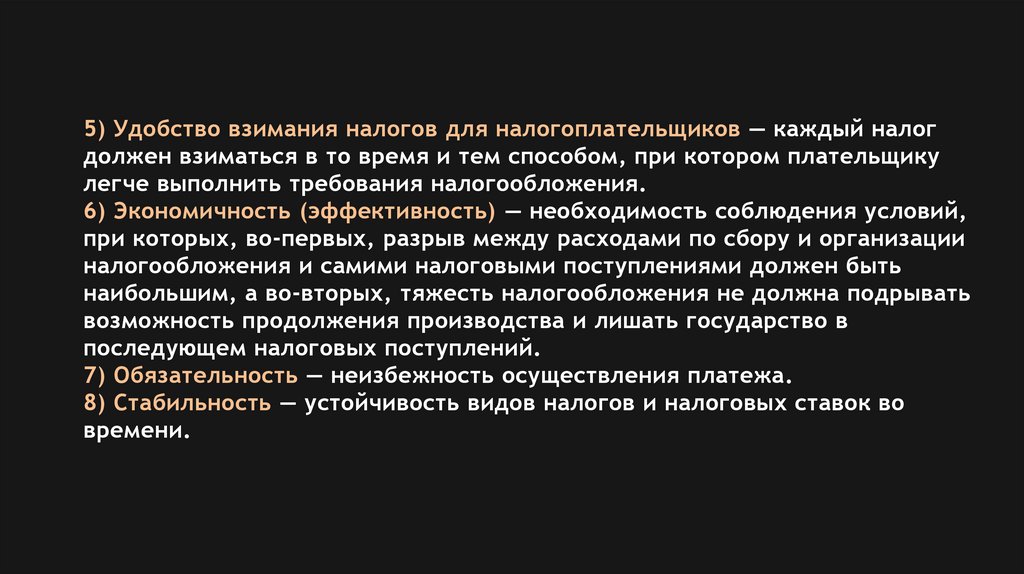 8) Стабильность — устойчивость видов налогов и налоговых ставок во