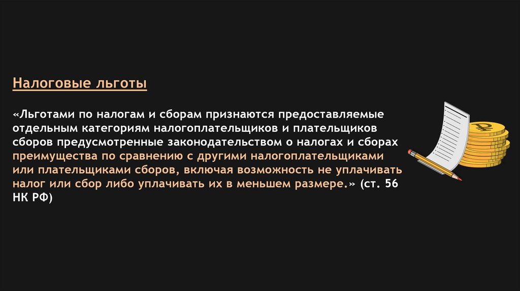 Налоговые льготы«Льготами по налогам и сборам признаются предоставляемые