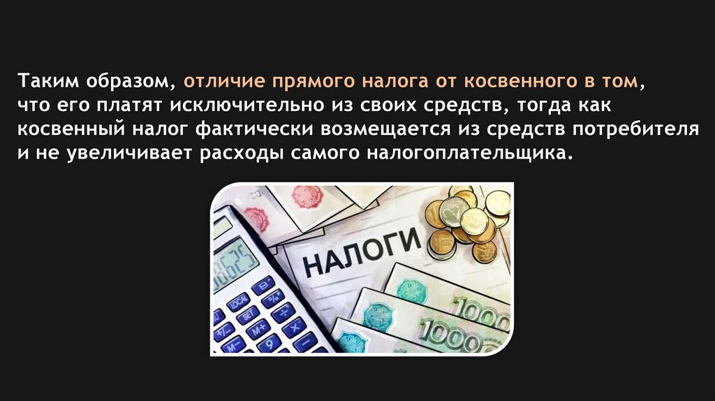 Таким образом, отличие прямого налога от косвенного в том,что его платят исключительно из своих средств, тогда как