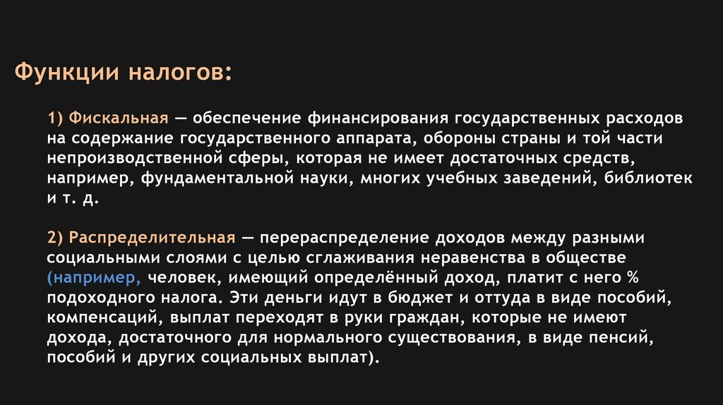 Функции налогов:1) Фискальная — обеспечение финансирования государственных расходов