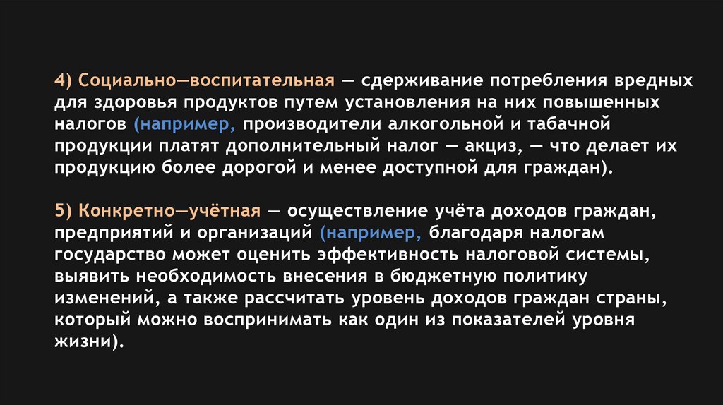 4) Социально—воспитательная — сдерживание потребления вредныхдля здоровья продуктов путем установления на них повышенных