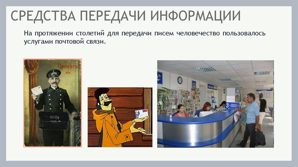СРЕДСТВА ПЕРЕДАЧИ ИНФОРМАЦИИНа протяжении столетий для передачи писем человечество пользовалось