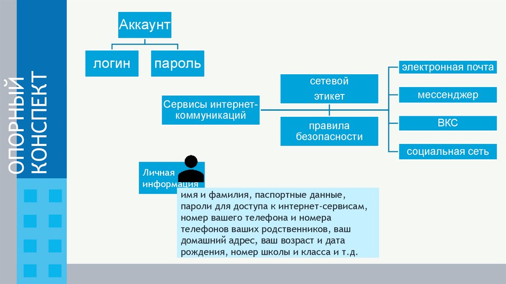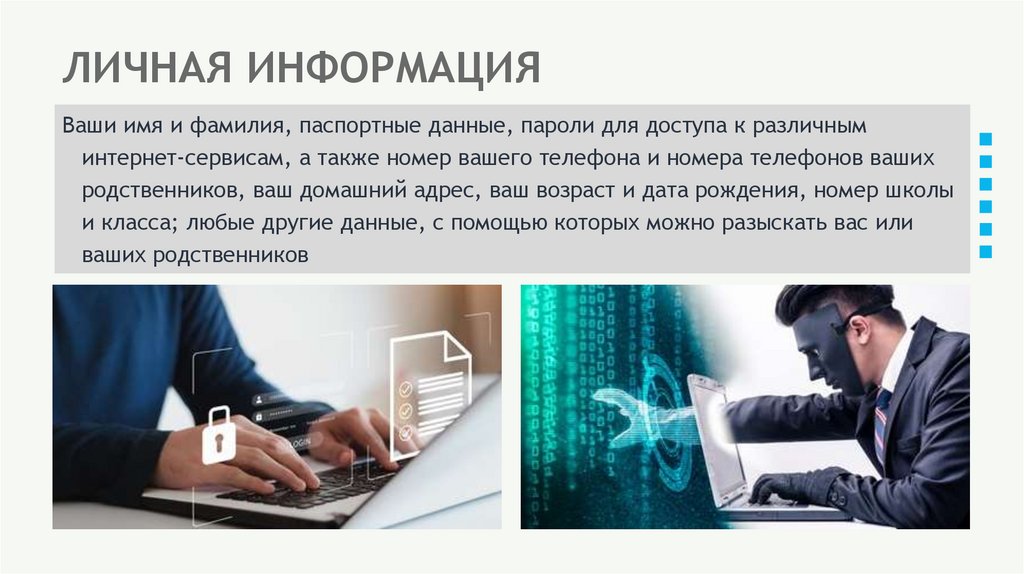 ЛИЧНАЯ ИНФОРМАЦИЯВаши имя и фамилия, паспортные данные, пароли для доступа к различным