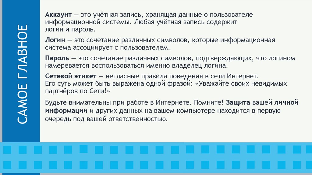 САМОЕ ГЛАВНОЕАккаунт — это учётная запись, хранящая данные о пользователе