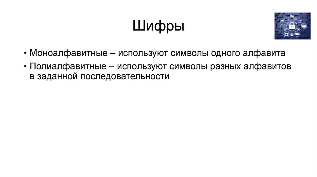 Шифры• Моноалфавитные – используют символы одного алфавита