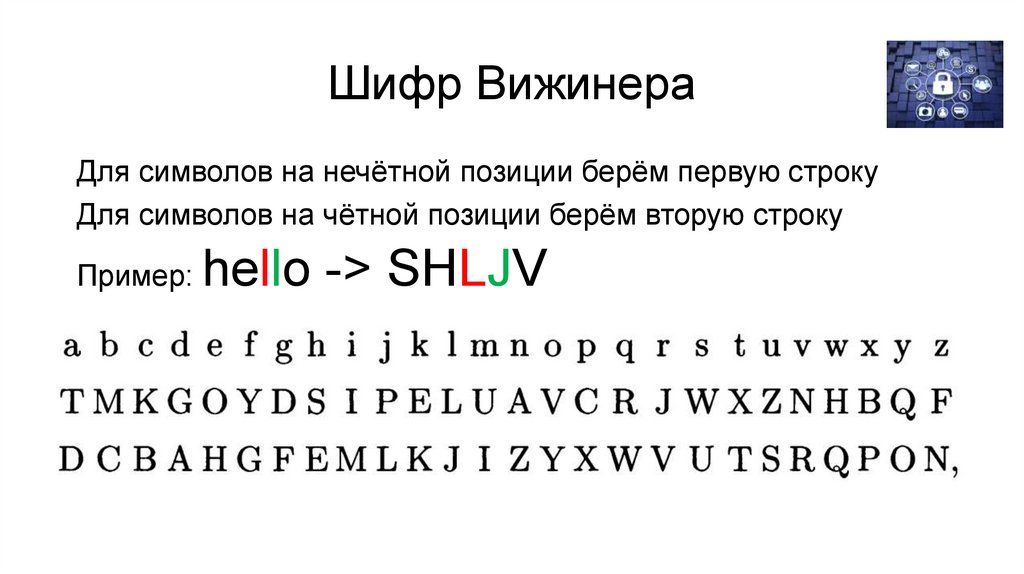 Шифр ВижинераДля символов на нечётной позиции берём первую строку