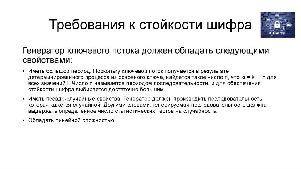 Требования к стойкости шифраГенератор ключевого потока должен обладать следующими