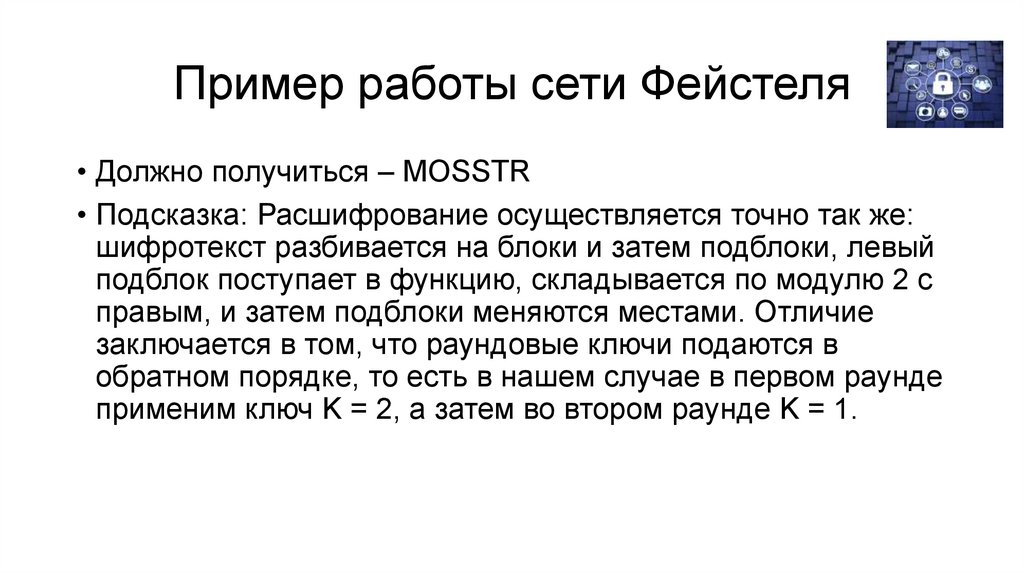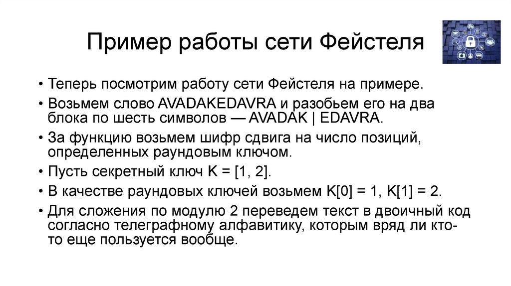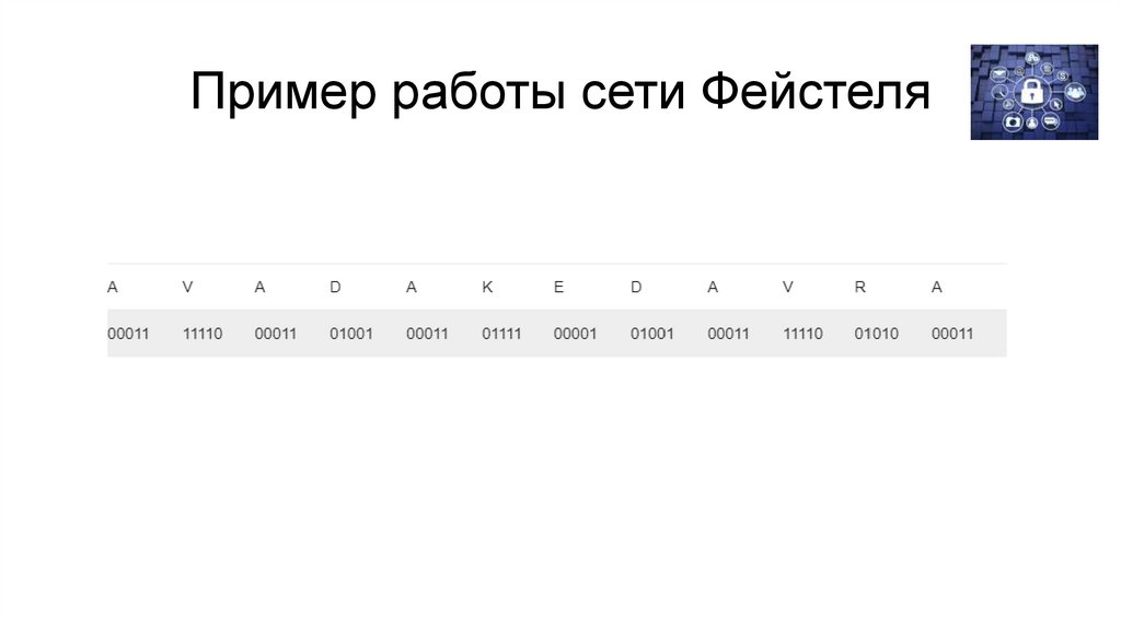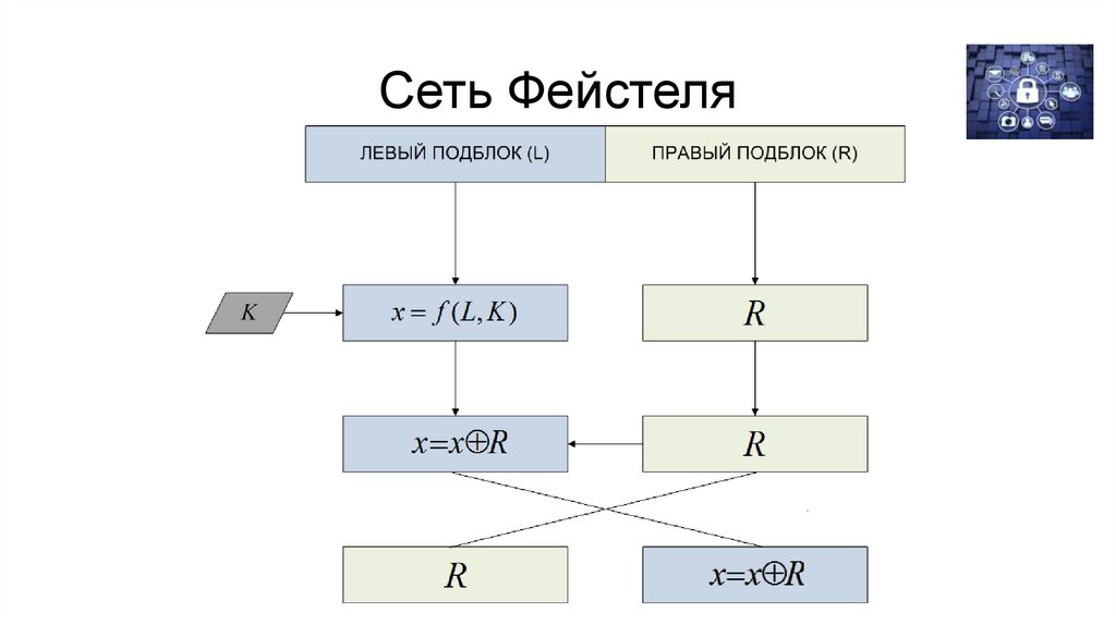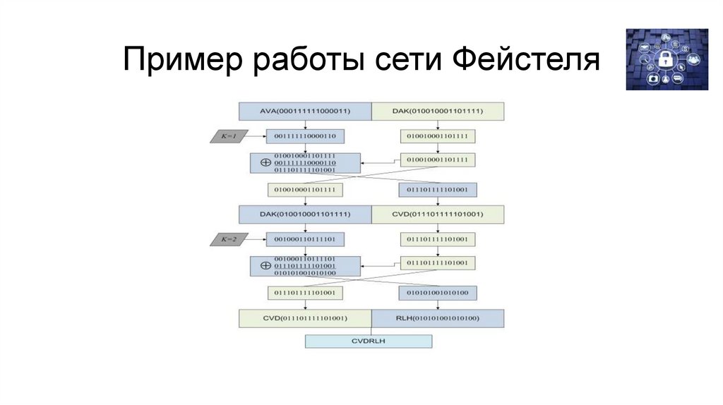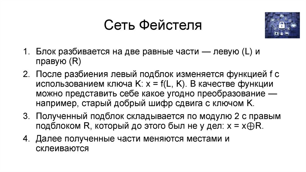 Фейстеля. AES оперирует 128-битными блоками данных и