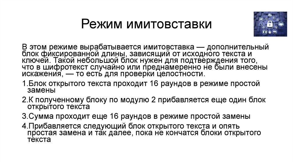 Режим имитовставкиВ этом режиме вырабатывается имитовставка — дополнительный