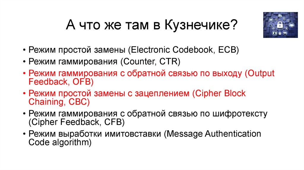 А что же там в Кузнечике?• Режим простой замены (Electronic Codebook, ЕСВ)