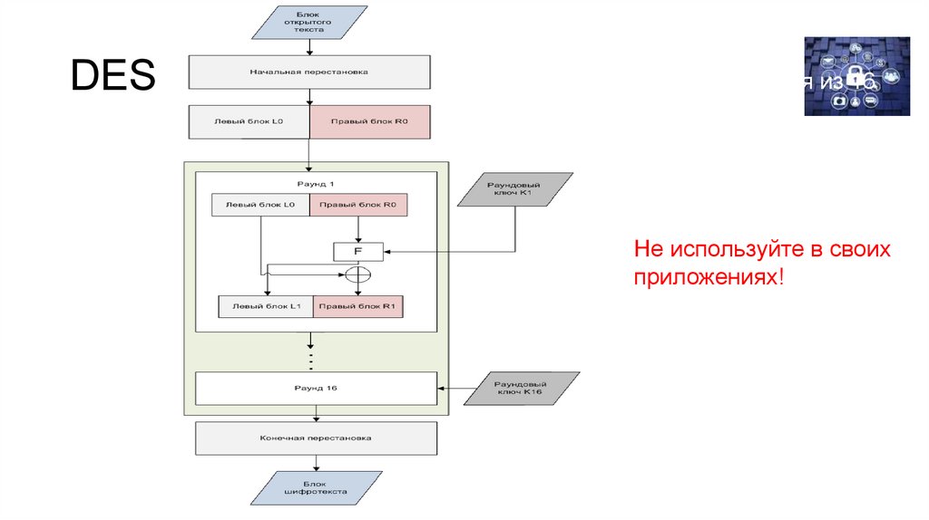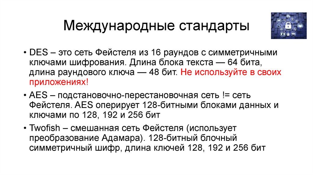 Международные стандарты• DES – это сеть Фейстеля из 16 раундов с симметричными