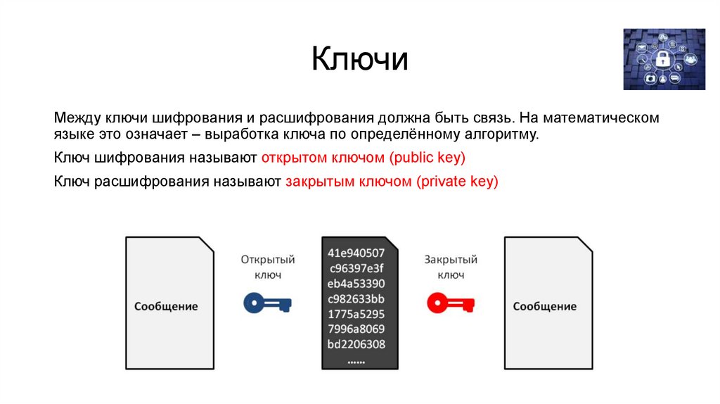 КлючиМежду ключи шифрования и расшифрования должна быть связь. На математическом