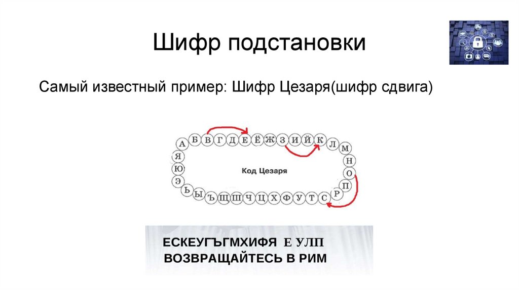 Шифр подстановкиСамый известный пример: Шифр Цезаря(шифр сдвига)
