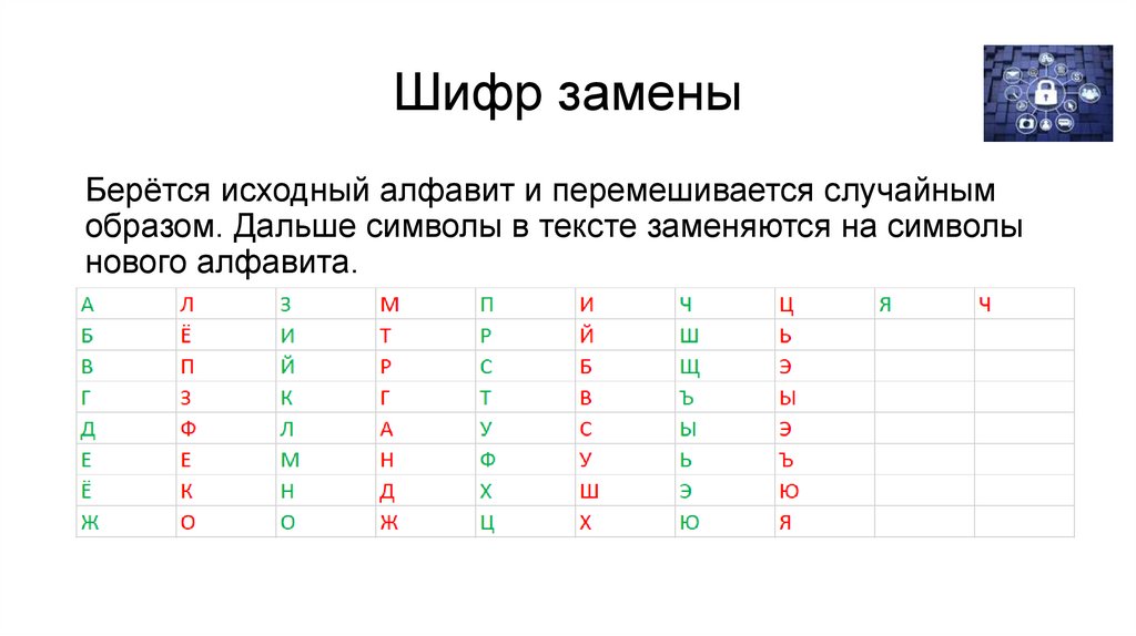 Шифр заменыБерётся исходный алфавит и перемешивается случайным