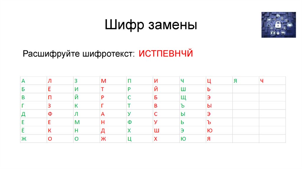 Шифр заменыРасшифруйте шифротекст: ИСТПЕВНЧЙ