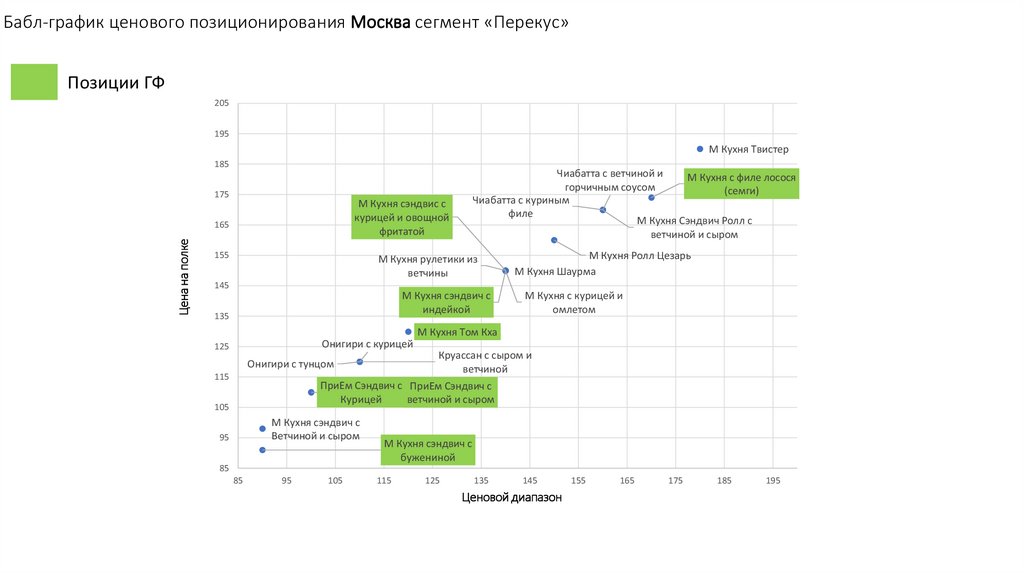 Бабл-график ценового позиционирования Москва сегмент «Перекус»Позиции ГФ