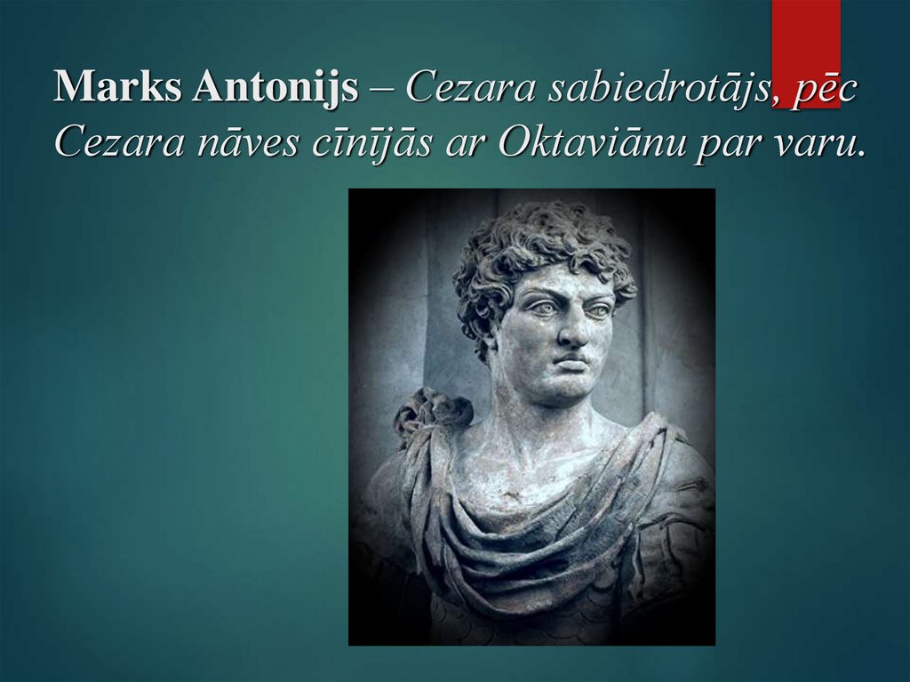 Marks Antonijs – Cezara sabiedrotājs, pēcCezara nāves cīnījās ar Oktaviānu par varu.