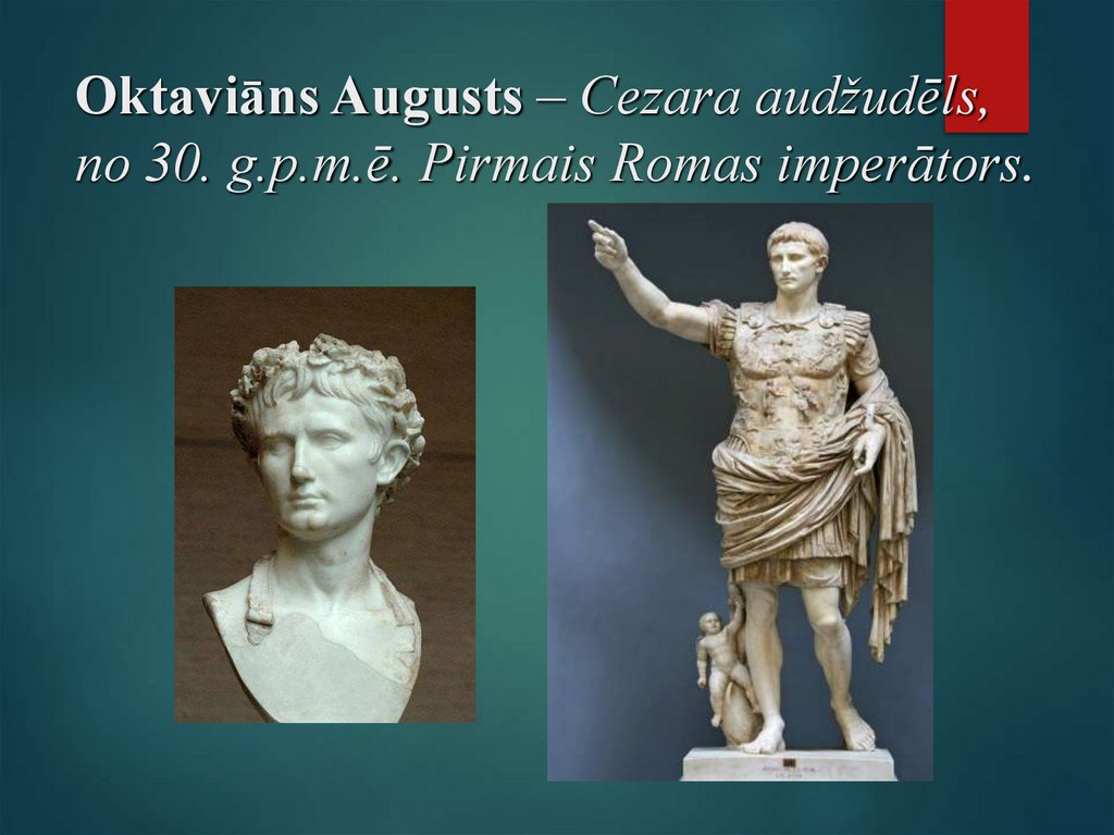 Oktaviāns Augusts – Cezara audžudēls,no 30. g.p.m.ē. Pirmais Romas imperātors.
