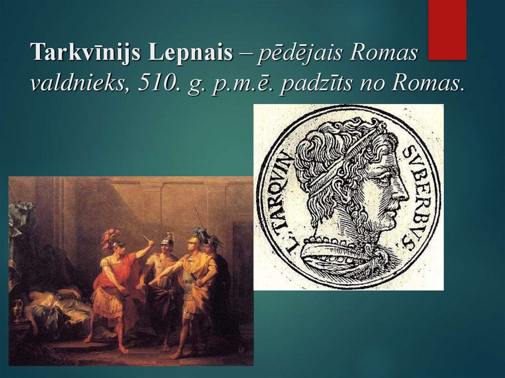 Tarkvīnijs Lepnais – pēdējais Romasvaldnieks, 510. g. p.m.ē. padzīts no Romas.