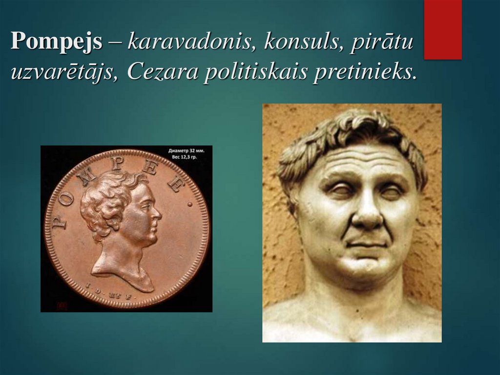 Pompejs – karavadonis, konsuls, pirātuuzvarētājs, Cezara politiskais pretinieks.