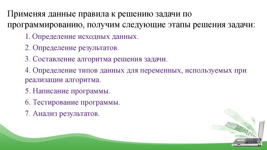 Применяя данные правила к решению задачи попрограммированию, получим следующие этапы решения задачи: