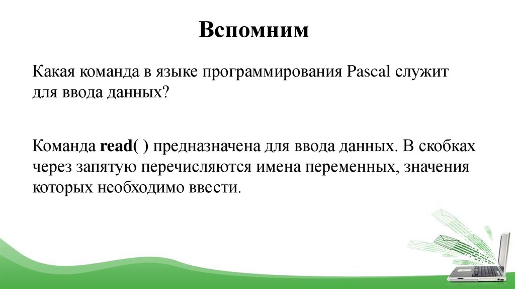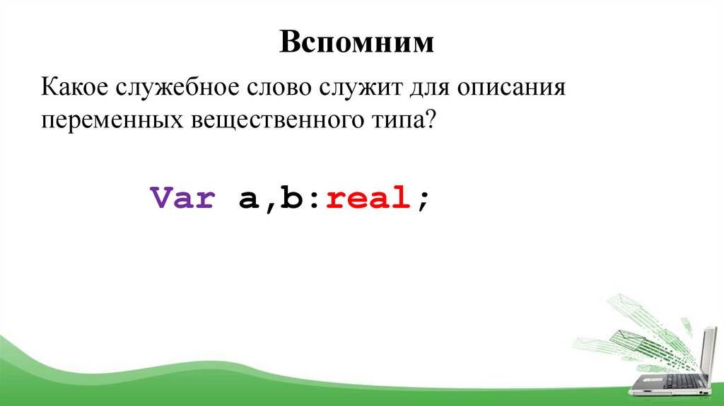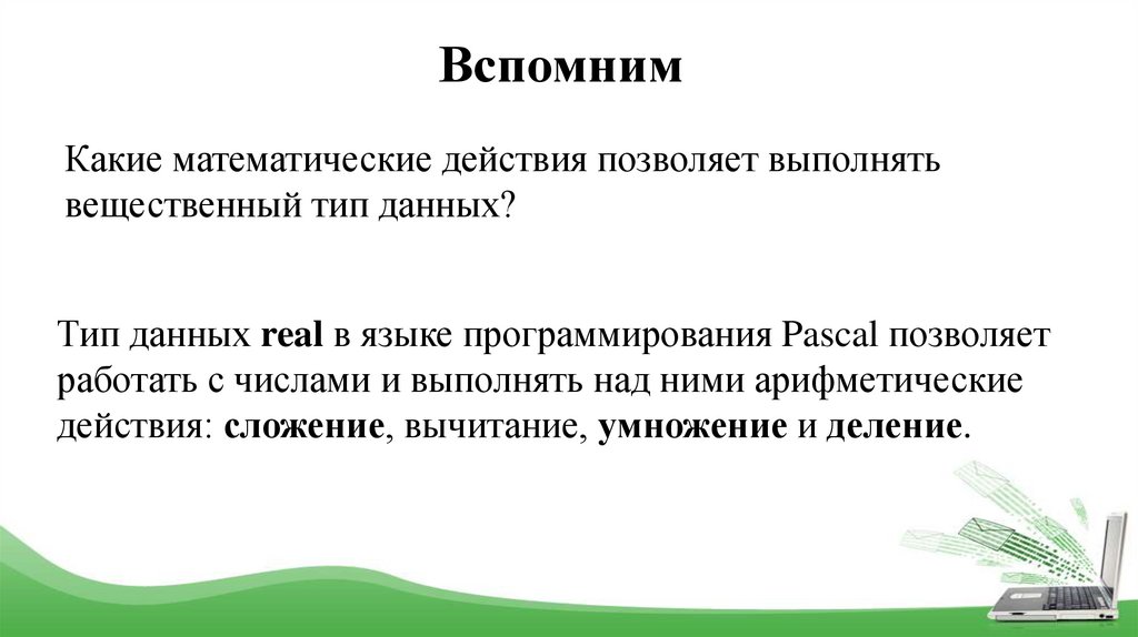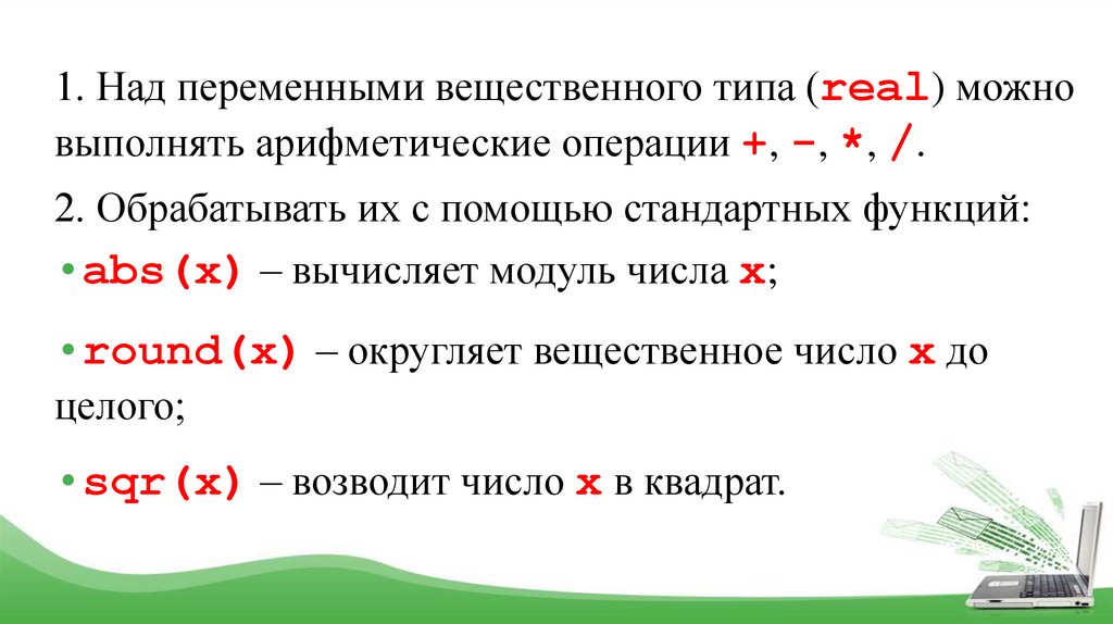 1. Над переменными вещественного типа (real) можновыполнять арифметические операции +, -, *, /.