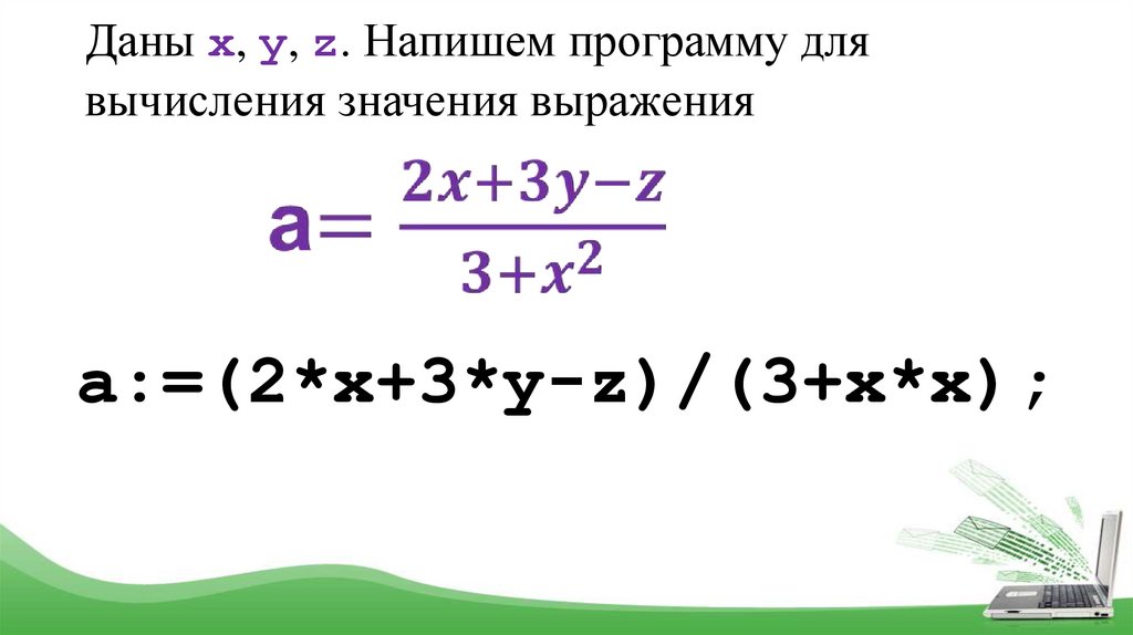 Даны x, y, z. Напишем программу длявычисления значения выражения