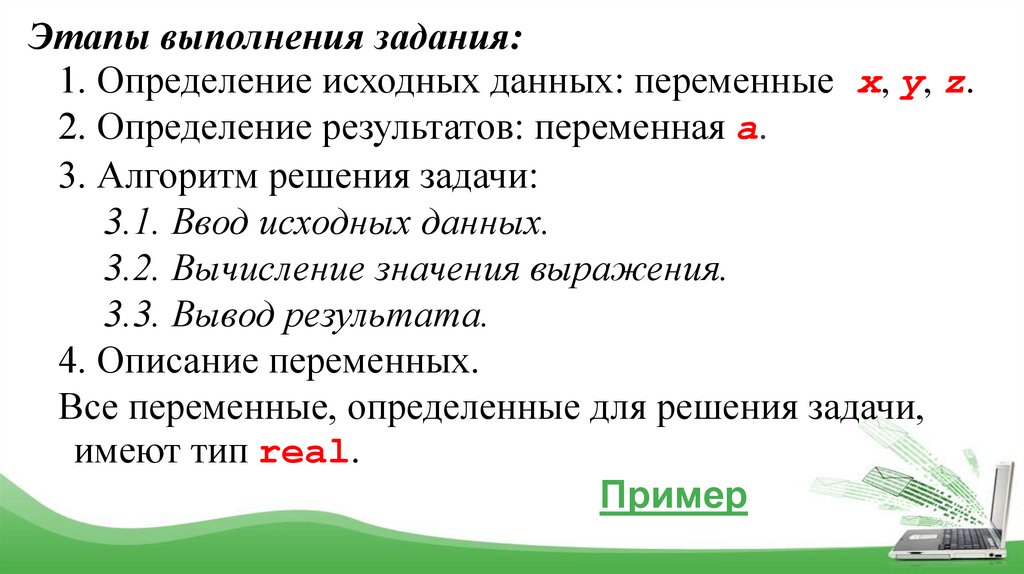 Этапы выполнения задания:1. Определение исходных данных: переменные x, y, z.