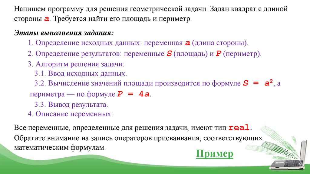 Напишем программу для решения геометрической задачи. Задан квадрат с длинойстороны a. Требуется найти его площадь и периметр.