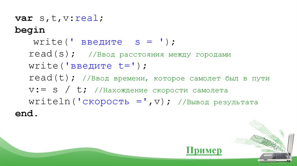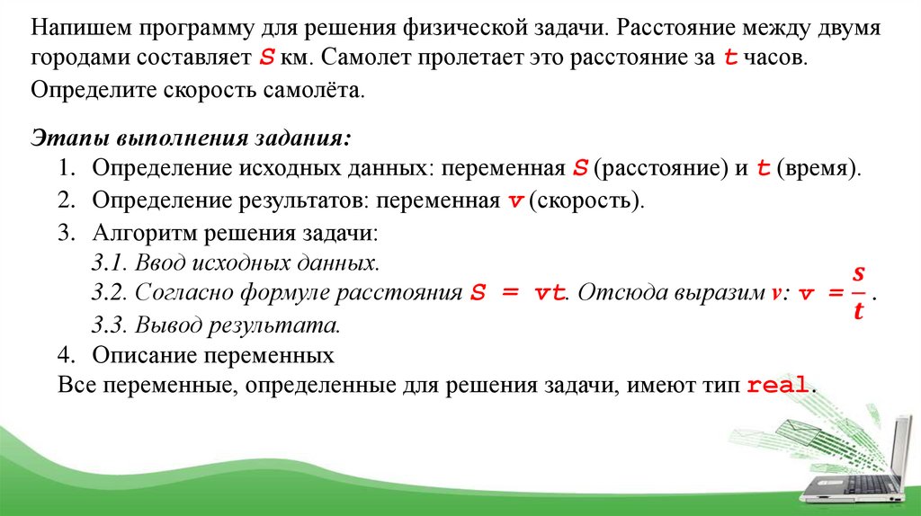 Напишем программу для решения физической задачи. Расстояние между двумягородами составляет S км. Самолет пролетает это расстояние за t часов.