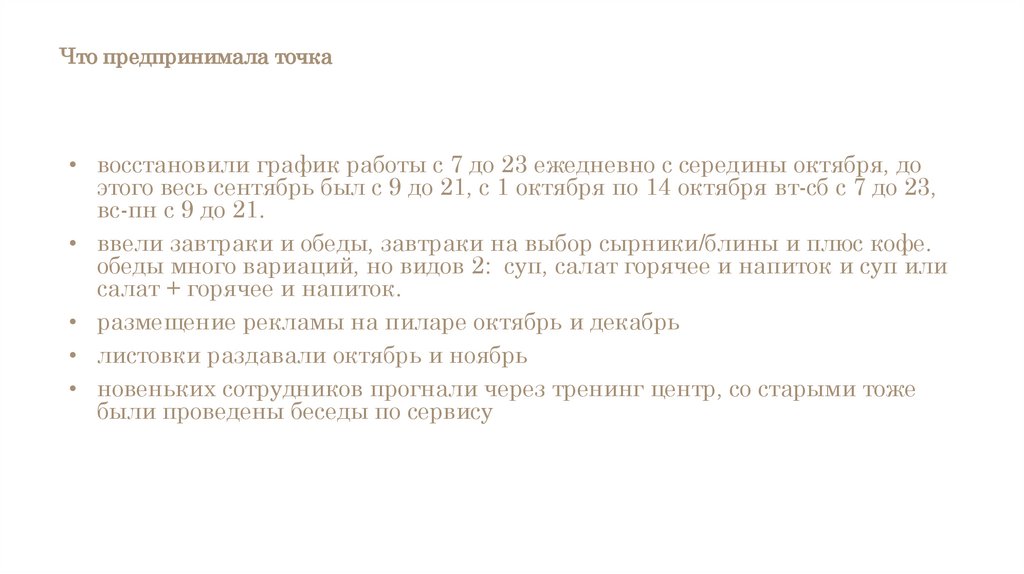 Что предпринимала точка• восстановили график работы с 7 до 23 ежедневно с середины октября, до