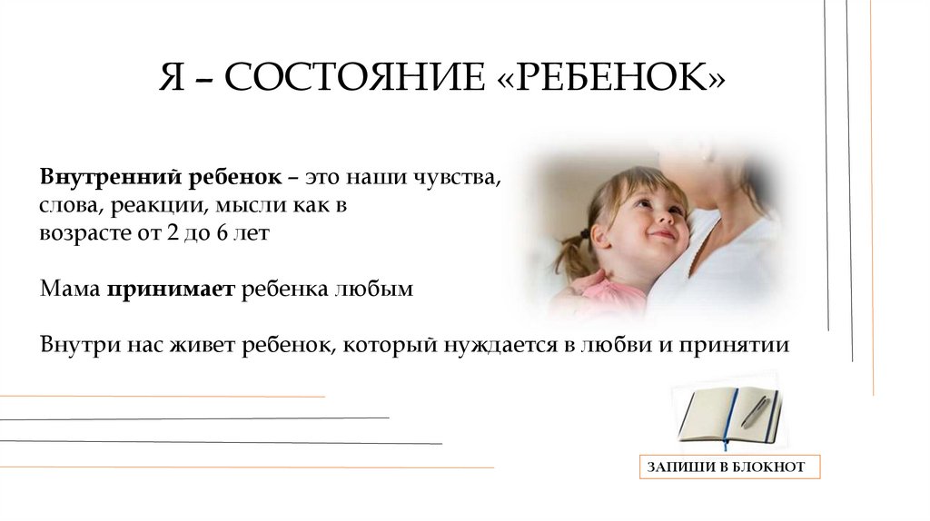 Я – СОСТОЯНИЕ «РЕБЕНОК»Внутренний ребенок – это наши чувства,