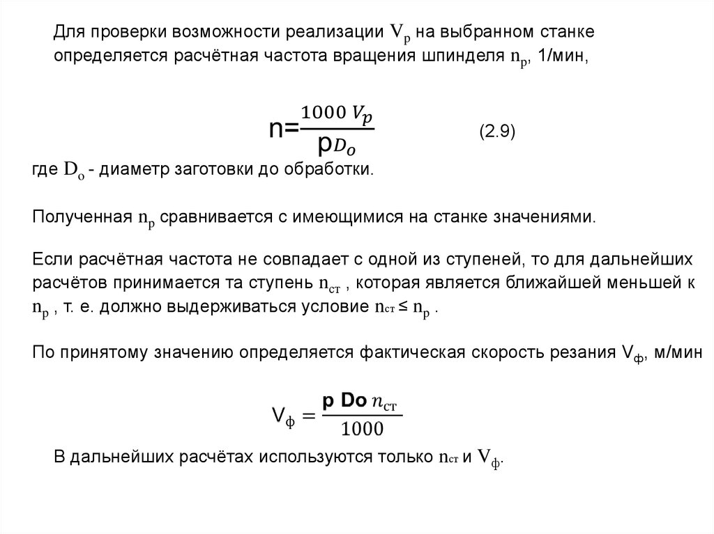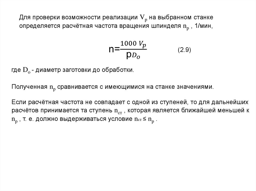 Для проверки возможности реализации Vp на выбранном станкеопределяется расчётная частота вращения шпинделя np, 1/мин,