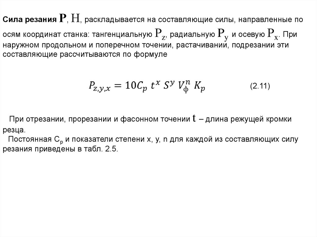 Сила резания Р, Н, раскладывается на составляющие силы, направленные поосям координат станка: тангенциальную Рz, радиальную Py и осевую Рx. При
