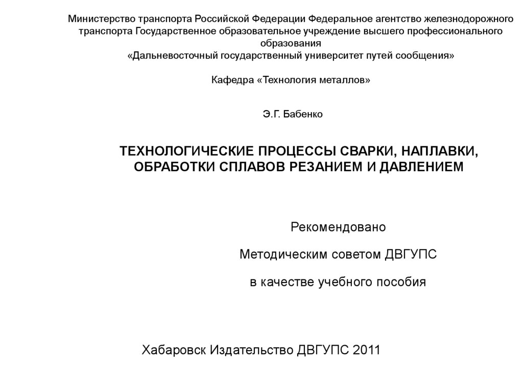 Бабенко, Э.Г. Технологические процессы сварки, наплавки, обработки сплавов