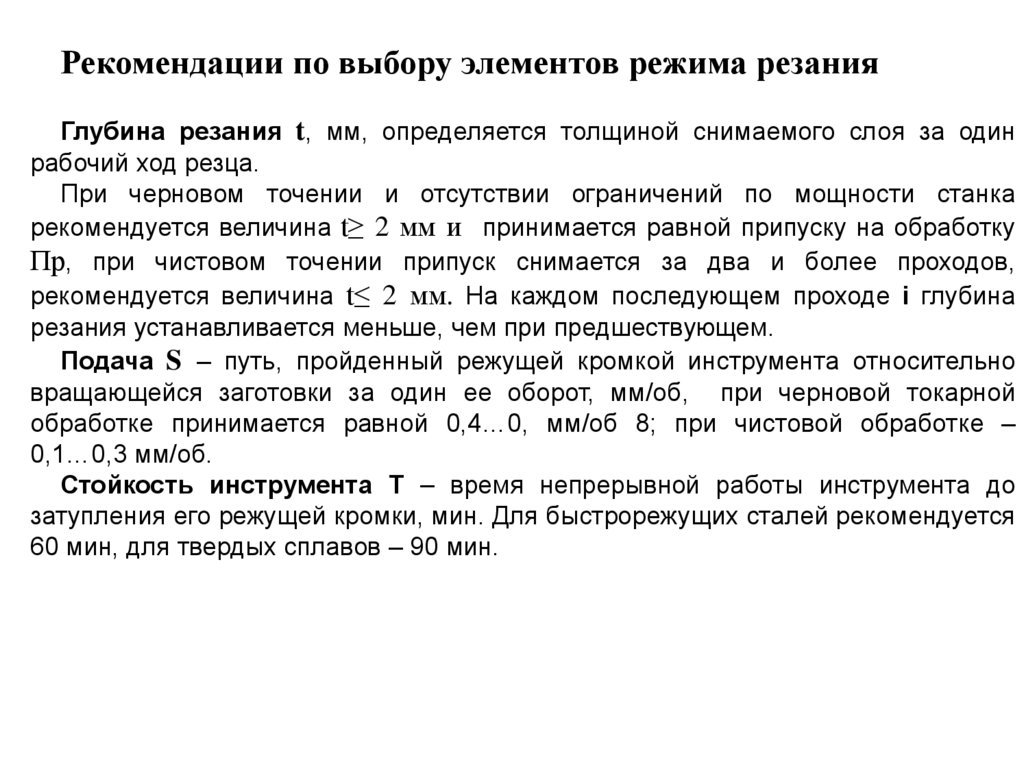 Рекомендации по выбору элементов режима резанияГлубина резания t, мм, определяется толщиной снимаемого слоя за один