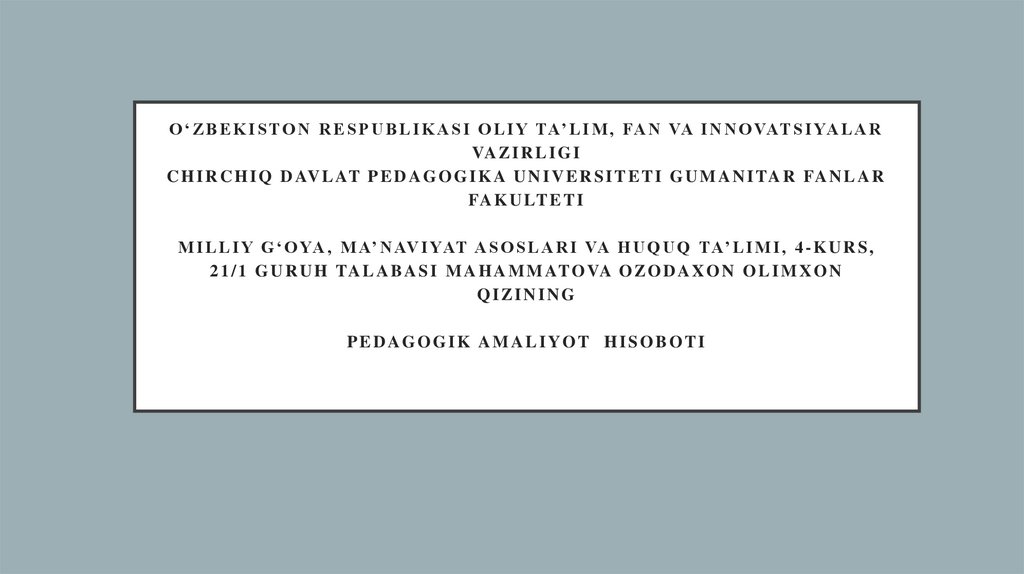 • AMALIYOTCHI TALABA TOMONIDAN KUZATILGAN DARSLAR TAHLILIChirchiq Davlat Pedagogika Universiteti Gumanitar fanlar fakulteti 4-bosqich talabasi Mahammatova Ozodaxon