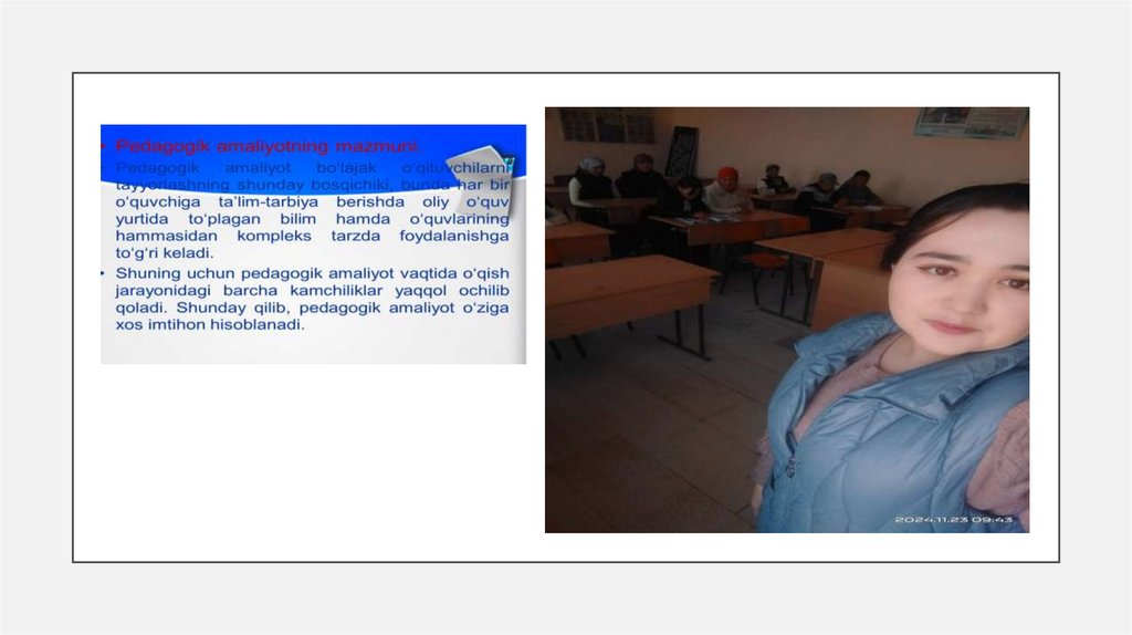 Olimxon qizi amaliyot davrida biriktrilga 5-,6-,8-,9-,7-,11- siniflarda dars mashg;ulotlarin kuzatdim, Kuzatishim