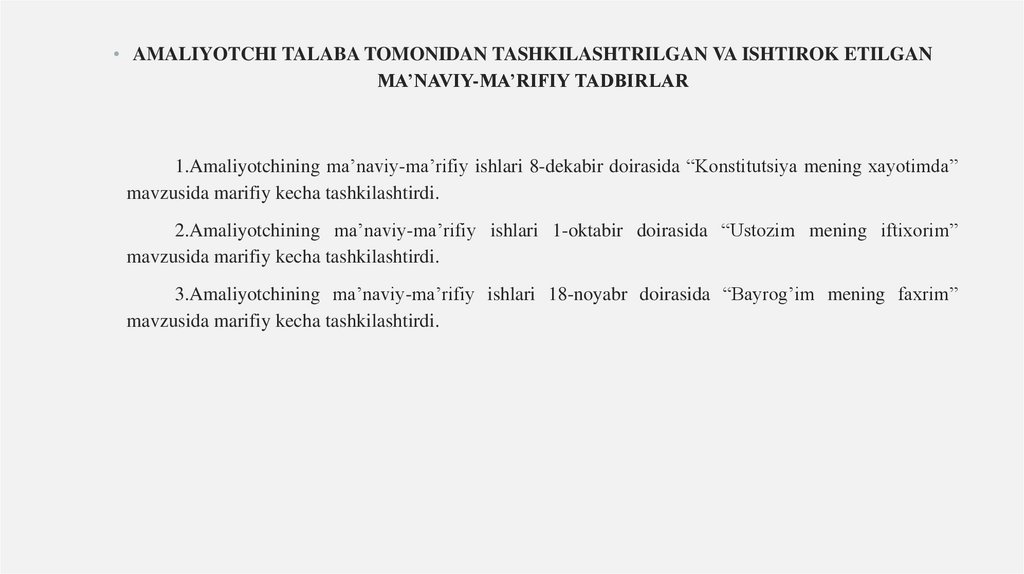 • AMALIYOTCHI TALABA TOMONIDAN TASHKILASHTRILGAN VA ISHTIROK ETILGANMA’NAVIY-MA’RIFIY TADBIRLAR