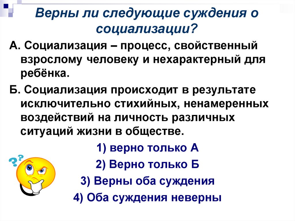 А. Социализация – процесс, свойственныйвзрослому человеку и нехарактерный для