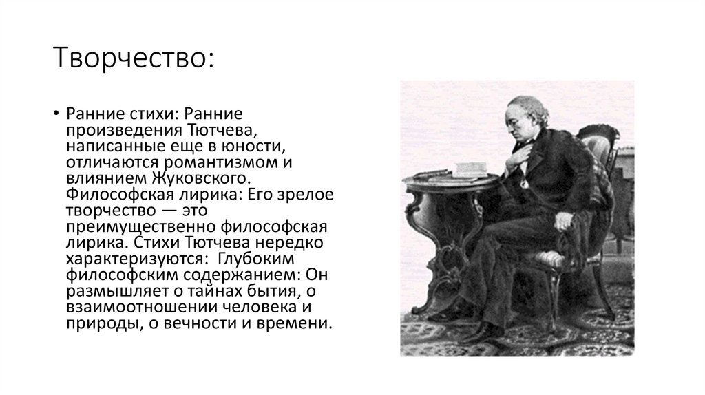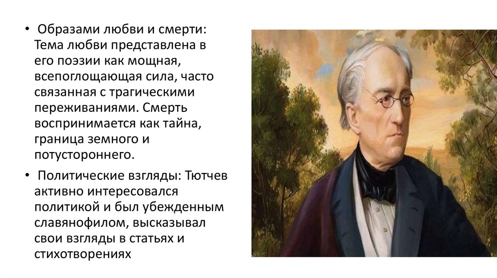 • Родина: Тютчев был патриотом и выражал свои чувства к родине