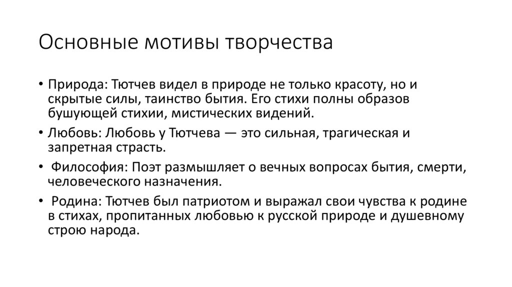 Основные мотивы творчества• Природа: Тютчев видел в природе не только красоту, но и