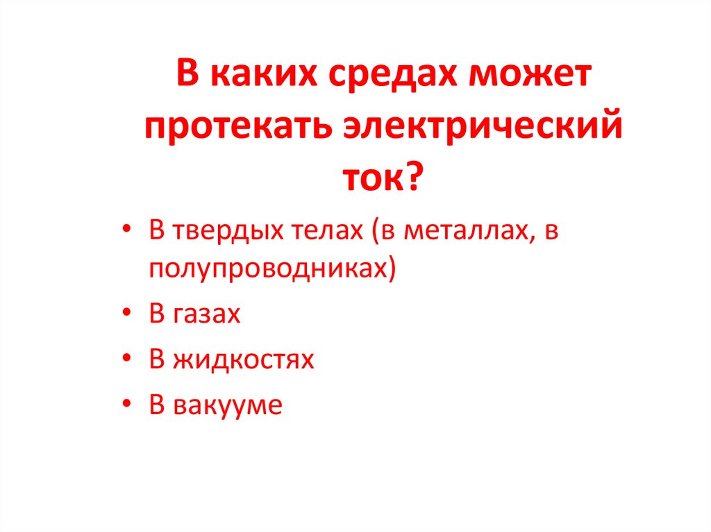 5. В каких средах может протекать ток? (начертите таблицу в тетради, ее надо заполнить, просматривая презентацию)