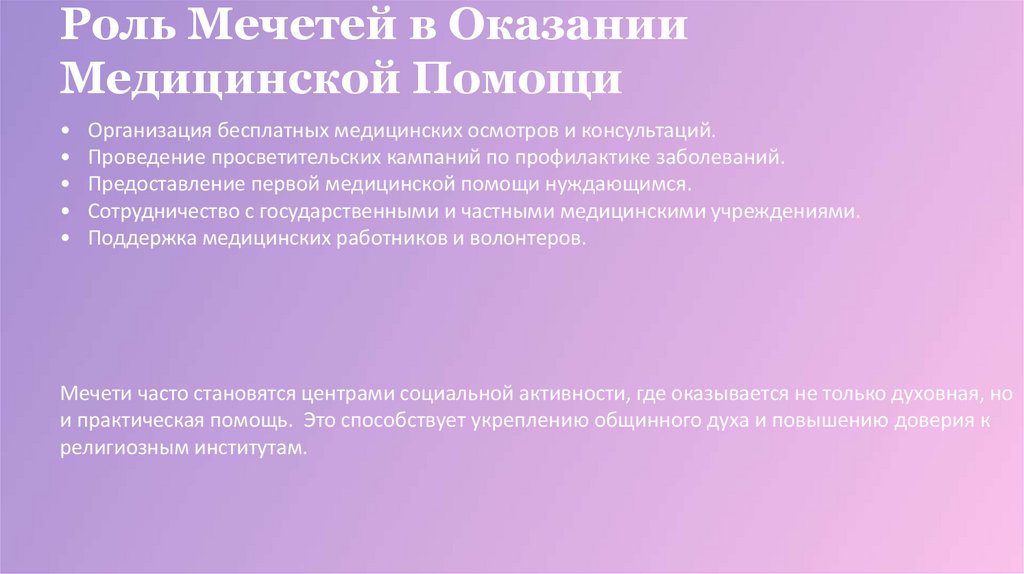 Социально-медицинская миссия современных мусульманских организаций. Роль мечетей в оказании медицинской помощи