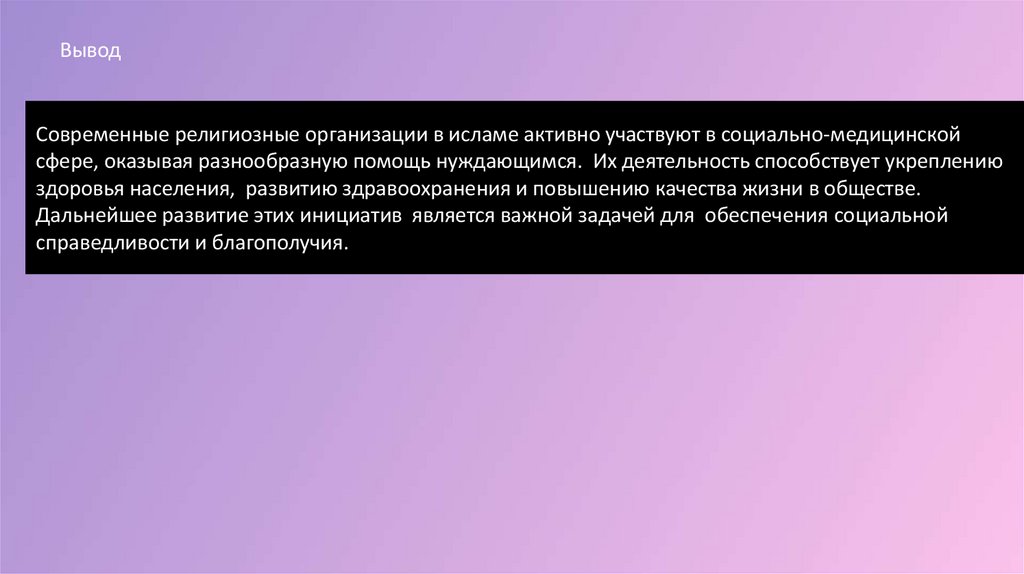 ВыводСовременные религиозные организации в исламе активно участвуют в социально-медицинской