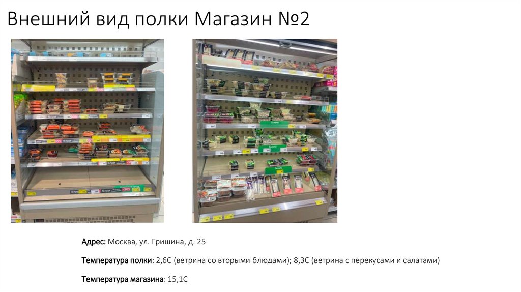 Температура полки: 2,6С (ветрина со вторыми блюдами); 8,3С (ветрина с перекусами и салатами)