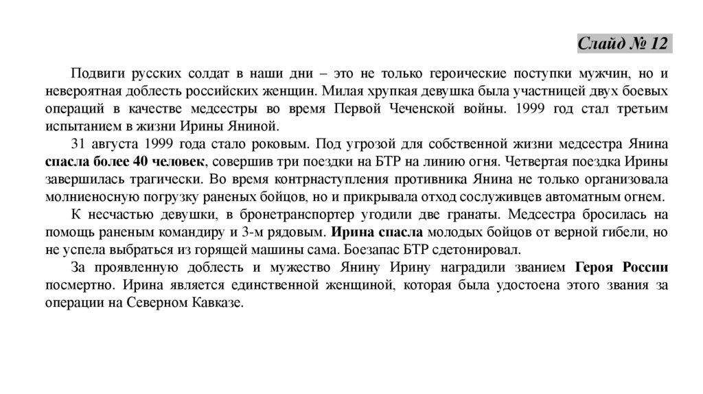 Слайд № 12Подвиги русских солдат в наши дни – это не только героические поступки мужчин, но и