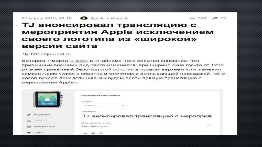 • «Самое быстрое и технологичное издание про то, что прямо сейчас происходит в сети.»• В первом квартале 2015 года TJ стали №1 среди самых цитируемых IT-СМИ по версии